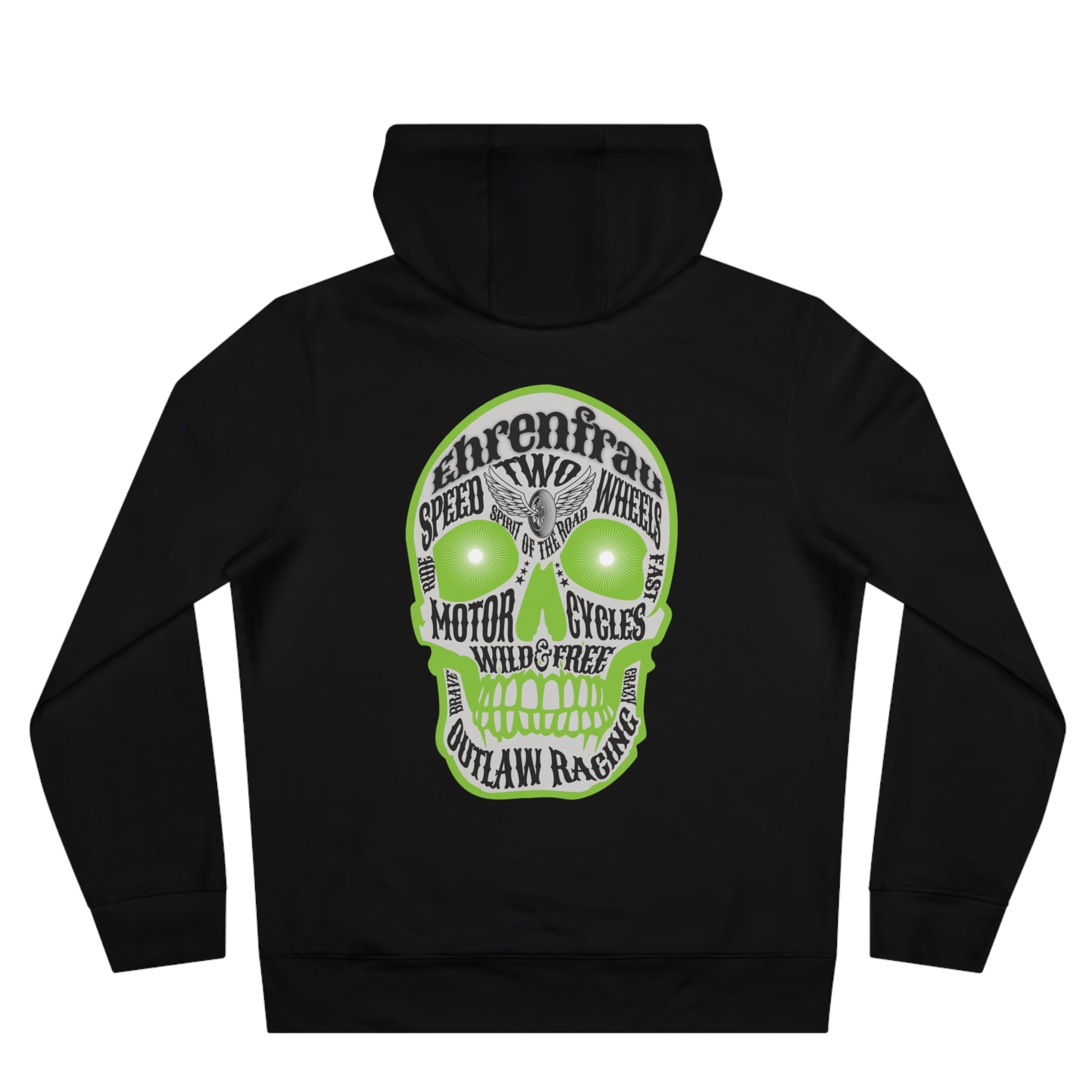 Der Ehrenfrau-Hoodie verbindet rebellischen Biker-Spirit mit hochwertigem Tragekomfort. Der große Skull-Print auf dem Rücken zieht garantiert Blicke auf sich und ist perfekt für alle, die Power, Freiheit und Charakter leben. Ob auf dem Bike, beim Treffen mit der Crew oder im Alltag - dieser Hoodie zeigt, wofür du stehst: Two Wheels. One Life. 100% Rebel Energy.