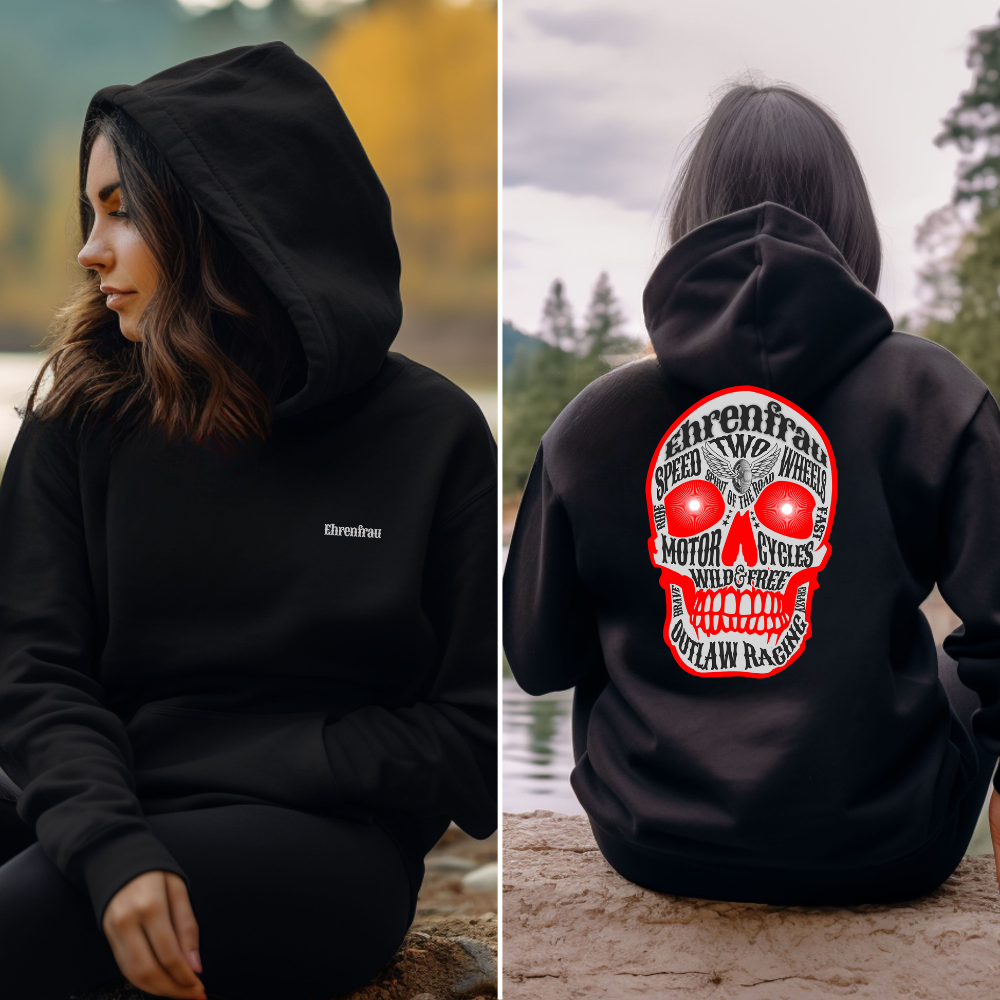 Der Ehrenfrau-Hoodie verbindet rebellischen Biker-Spirit mit hochwertigem Tragekomfort. Der große Skull-Print auf dem Rücken zieht garantiert Blicke auf sich und ist perfekt für alle, die Power, Freiheit und Charakter leben. Ob auf dem Bike, beim Treffen mit der Crew oder im Alltag - dieser Hoodie zeigt, wofür du stehst: Two Wheels. One Life. 100% Rebel Energy.